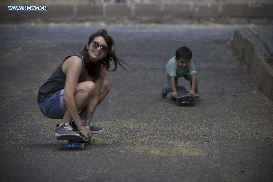 Image taken on May 7, 2015 shows Sol Diaz skating with her son Farid in Mexico City, capital of Mexico. Sol Diaz is a single mother with a three-year-old son, a general manager of a skating magazine, and a co-owner of a skateboard shop in partnership with her boyfriend. Mother's Day, which falls on May 10 in Mexico, is a festival that is in honor of mothers and celebrated at different dates around the world. (Xinhua/Alejandro Ayala)
