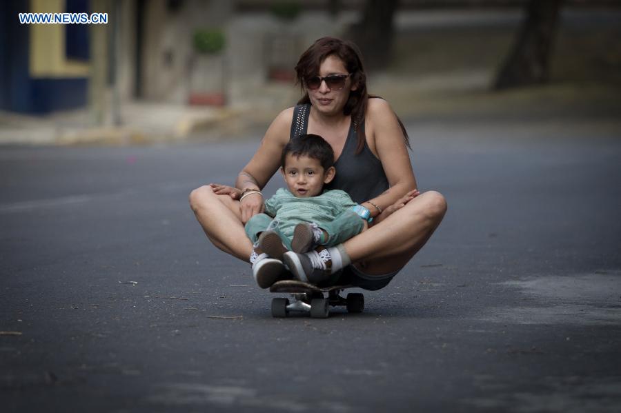 Image taken on May 7, 2015 shows Sol Diaz walking with her son Farid in Mexico City, capital of Mexico. Sol Diaz is a single mother with a three-year-old son, a general manager of a skating magazine, and a co-owner of a skateboard shop in partnership with her boyfriend. Mother's Day, which falls on May 10 in Mexico, is a festival that is in honor of mothers and celebrated at different dates around the world. (Xinhua/Alejandro Ayala)