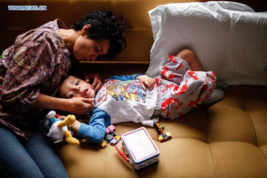 Sandra Aponte (L) huddles with her Three-year-old Martin in Bogota, Colombia, on May 9, 2015. 37-year-old Sandra is a graphic designer, photographer and teacher. Mother's Day is a festival that is in honor of mothers and celebrated at different dates around the world. (Xinhua/Jhon Paz)
