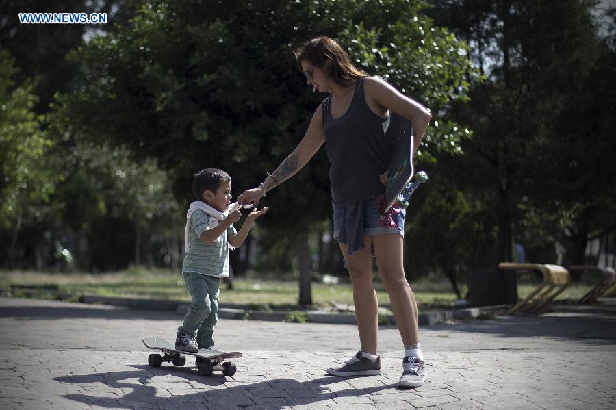Image taken on May 7, 2015 shows Sol Diaz giving a sweet to her son Farid in Mexico City, capital of Mexico. Sol Diaz is a single mother with a three-year-old son, a general manager of a skating magazine, and a co-owner of a skateboard shop in partnership with her boyfriend. Mother's Day, which falls on May 10 in Mexico, is a festival that is in honor of mothers and celebrated at different dates around the world. (Xinhua/Alejandro Ayala)