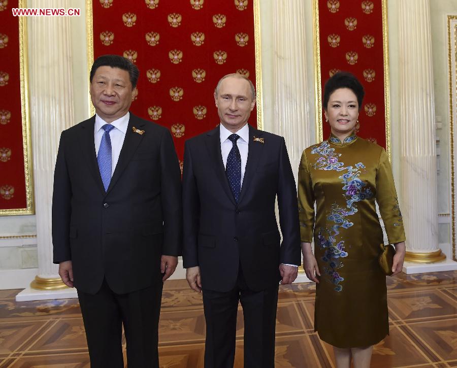 Chinese President Xi Jinping (L) and his wife Peng Liyuan (R) are welcomed by Russian President Vladimir Putin at the Kremlin in Moscow, Russia, May 9, 2015. Xi, hosted by Putin, was among more than 20 leaders of countries, regions and international organizations to attend the commemorative event marking the 70th anniversary of the victory of the Great Patriotic War on Saturday. (Xinhua/Rao Aimin)