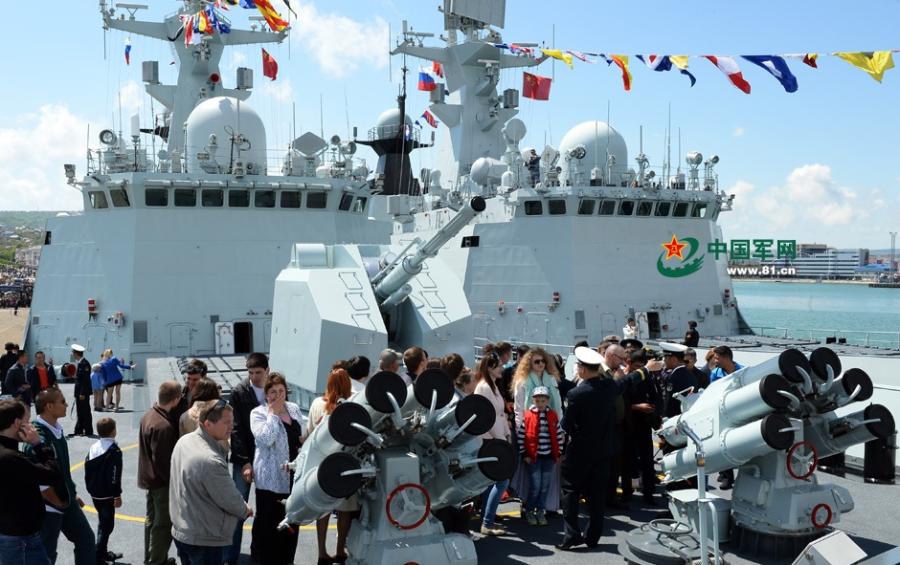 A Chinese navy official shows visitors around missile frigate Linyi during an open day at the Novorossiysk naval base, Russia, May 9, 2015. More than 3,000 visitors and Russian navy officials boarded the ship over two days. The ship arrived for the celebration of the 70th anniversary of the Soviet victory over Nazi Germany in WWI and will leave Novorossiysk for the Mediterranean Sea, where naval drills with Russia, dubbed Joint Sea 2015, will take place. (Photo: China News Service/Li Jing)