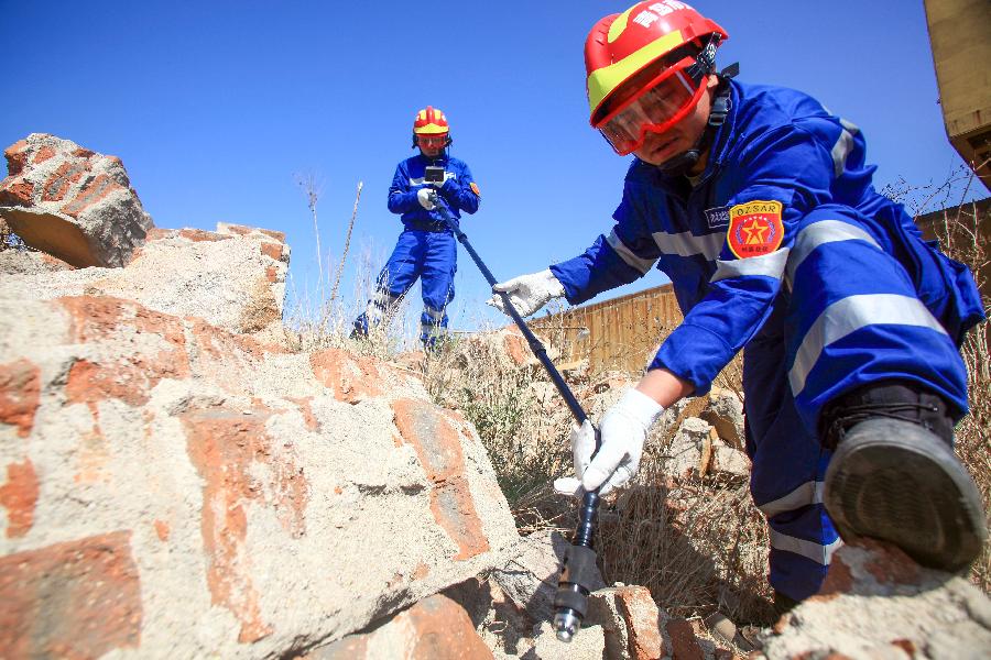 Rescuers demonstrate disaster response during an earthquake drill in Qingdao, east China's Shandong Province, May 11, 2015. (Xinhua/Wang Heng)