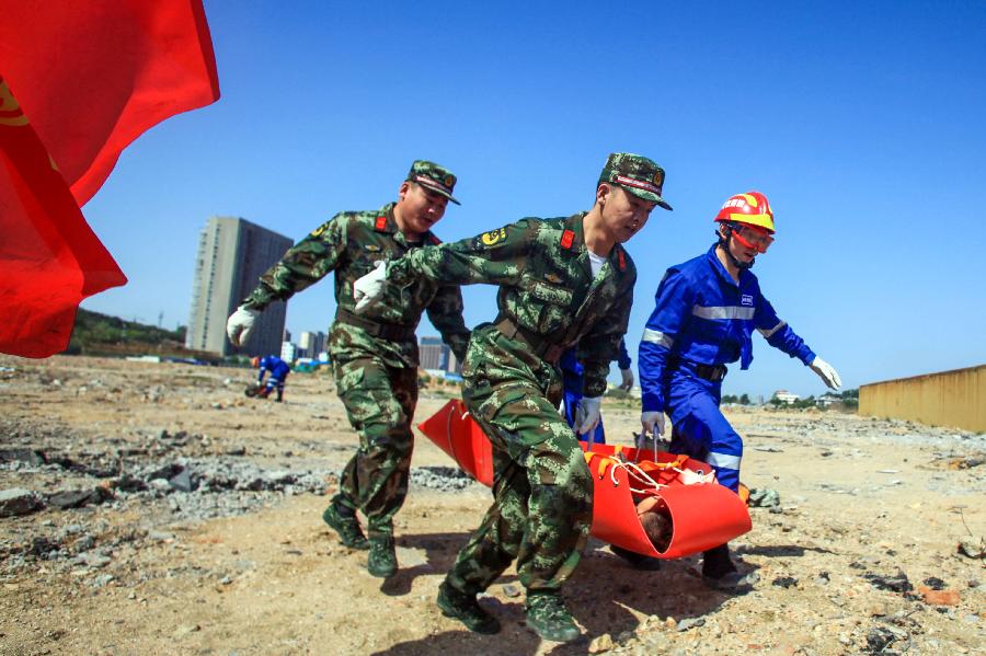 Rescuers carry a mock victim during an earthquake drill in Qingdao, east China's Shandong Province, May 11, 2015. (Xinhua/Wang Heng)