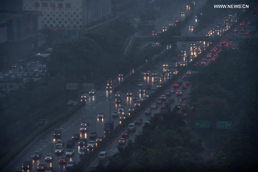 Vehicles move on a road during a rainstorm in Shenzhen, south China's Guangdong Province, May 11, 2015. A heavy rainstorm hit the city Monday. The local meteorological bureau issued red alert for rainstorms. (Xinhua/Mao Siqian)