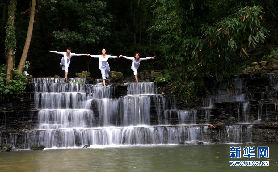 About 100 women come to Longgong Scenic Area to practice yoga and get relieved among the beautiful hills and clear water on May 10. (Xinhua/ Lu Wei)
