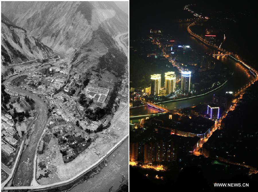 Combination photo taken on May 14, 2008 (upper) and May 6, 2015 shows a sharp contrast of an aerial view of Wenchuan County, which was hit by an 8.0-magnitude earthquake on May 12, 2008, southwest China's Sichuan Province. Tuesday is the 7th anniversary of China's Wenchuan earthquake, over 80,000 people reported dead or missing. (Xinhua/Xu Zhuangzhi and Luo Guoyang)