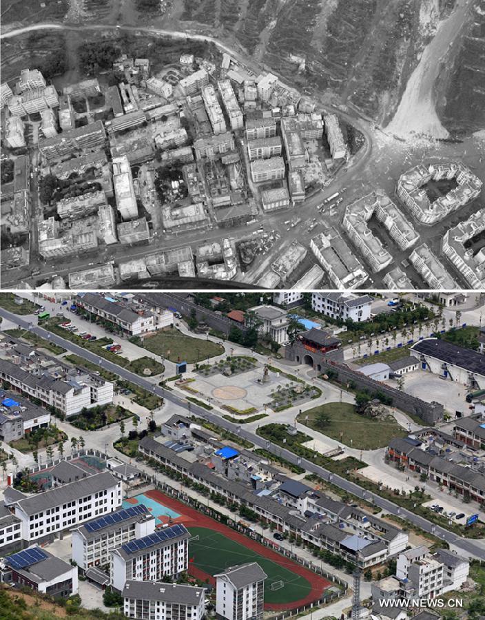 Combination photo taken on May 14, 2008 (upper) and May 6, 2015 shows a sharp contrast of an aerial view of Wenchuan County, which was hit by an 8.0-magnitude earthquake on May 12, 2008, southwest China's Sichuan Province. Tuesday is the 7th anniversary of China's Wenchuan earthquake, over 80,000 people reported dead or missing. (Xinhua/Xu Zhuangzhi and Luo Guoyang)
