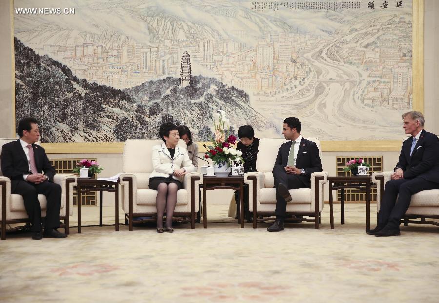 | Yan Junqi (2nd L), vice chairwoman of the Standing Committee of China's National People's Congress, meets with Denmark's Social Minister Manu Sareen(2nd R) before a reception celebrating the 65th anniversary of the establishment of China-Denmark diplomatic ties, in Beijing, capital of China, May 11, 2015. (Xinhua/Ding Lin) |