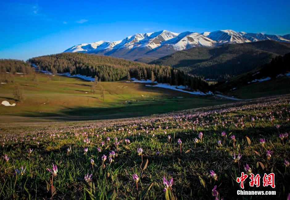 Nurtured by water released by the melting of snow, all kinds of plants on the Altai Mountains are starting to bloom. In the next two month, more kinds of flowers will bloom in Kanas, which is known as the "God's backyard garden." (Chinanews/Lei Dongxiang)