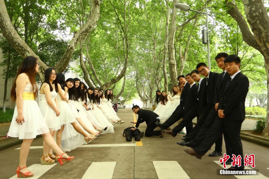 Graduates of Anhui University wear different kinds of costumes to take creative graduation photos on May 10. As the graduation season comes, graduates begin to take creative and stylish graduation photos to memorize their college life. (Chinanews/Han Suyuan)