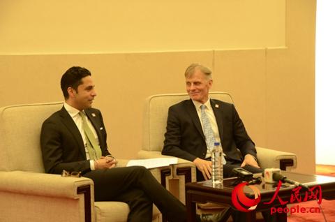 | Minister Manu Sareen and Ambassador Friis Arne Petersen at a press briefing on the 11th of May at the Great Hall of the People. (People's Daily Online/Yao Xinyu) |