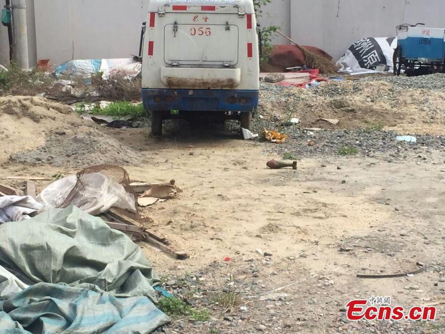 A mortar bomb has been found at a waste transfer station in Nanjing city, capital of East China’s Jiangsu province, May 13, 2015. Police say the bomb still posed a threat and they had professionals of explosive ordnance disposal deal with it. (Photo: China News Service/Qian Wei)