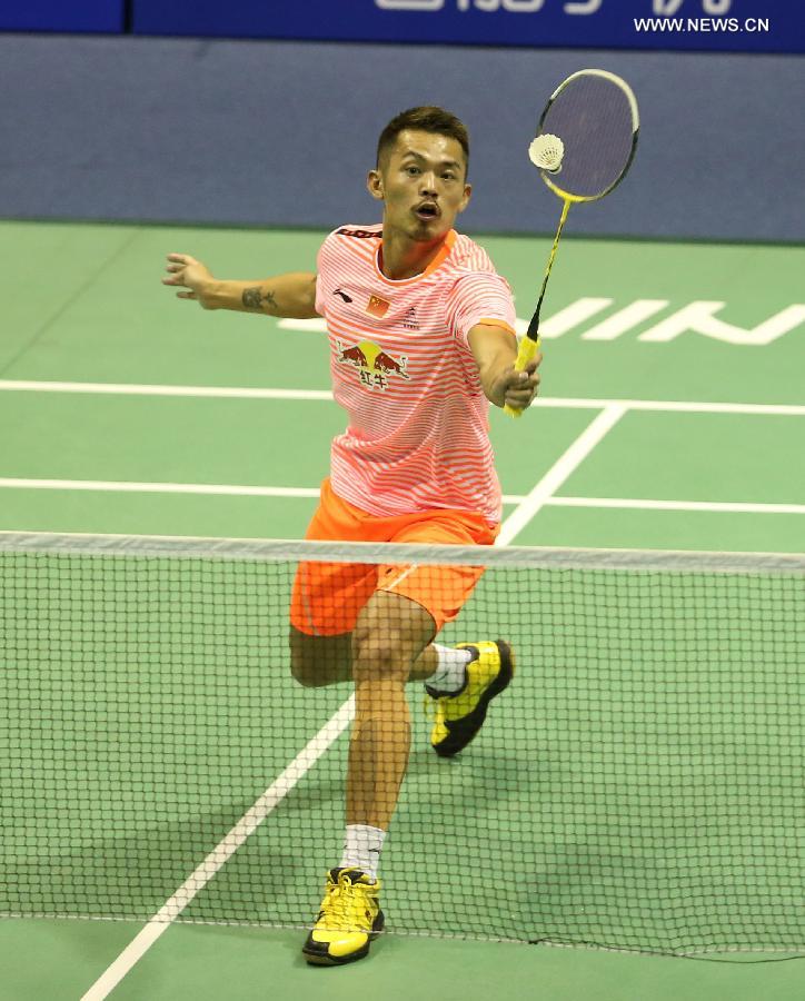 China's Lin Dan plays against Marc Zwiebler during the quarterfinal between China and Germany at 2015 Sudirman Cup BWF World Mixed Team Championships in Dongguan, south China's Guangdong Province, May 14, 2015. (Xinhua/Meng Yongmin)