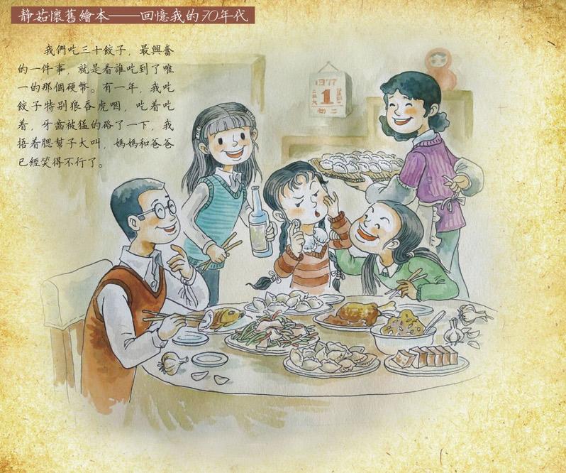 In cartoonist Jingru's work "Recall My 1970s", an illustration shows a girl finding a coin in her dumplings during the family dinner on the eve of the Lunar New Year. People always put coins when they make the dumplings, and whoever eats the dumpling with a coin is believed to have good luck in the New Year. (Photo/Xinhua)