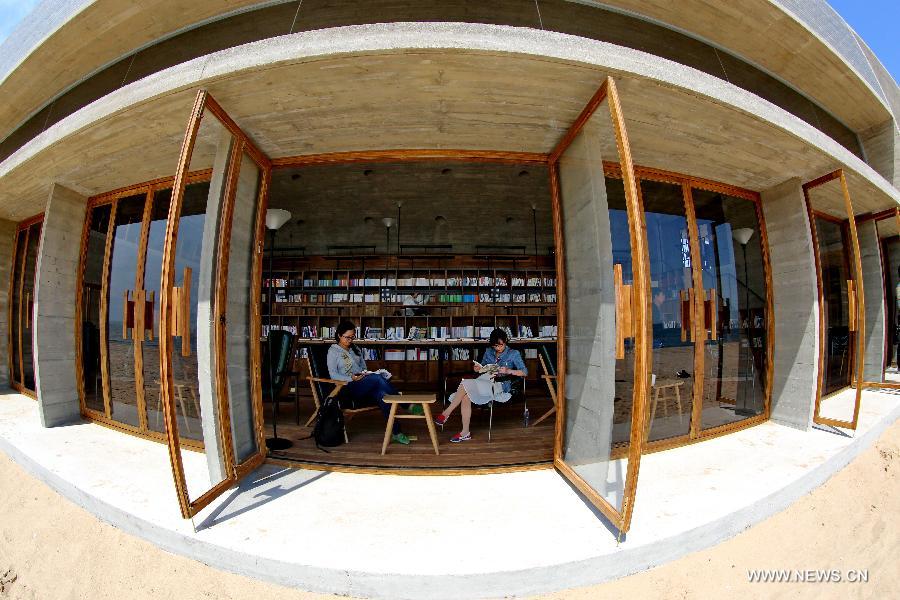 People read books at the seaside public library in Qinhuangdao, north China's Hebei Province, May 14, 2015. Situated on the seafront of Qinhuangdao, the newly-built library opened its door recently. Standing alone on an empty beach, the 450-square-meter library was called "the loneliest library" by Chinese netizens and became a hot topic quickly. Designed by an architect named Dong Gong, the two-story library creates a peaceful sea view for readers. (Xinhua/Yang Shiyao)
