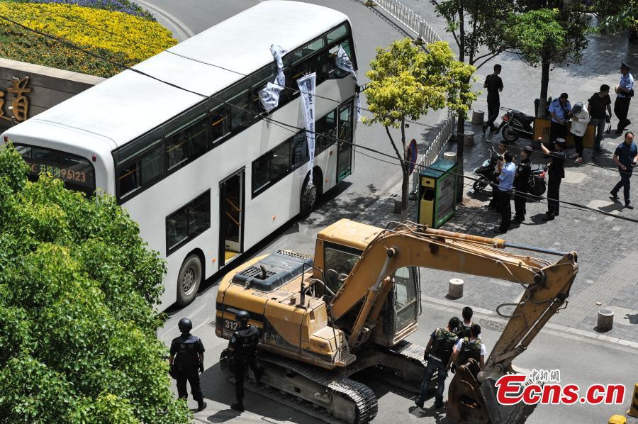 | Police rescue a woman taken as hostage on a double-decker bus in Kunming, Southwest China’s Yunnan province, May 14, 2015. The suspect was detained and the hostage was not hurt after a 50-minute standoff. The suspect also hung banners saying "seeking legal redress for villagers in Henan province”. (Photo: China News Service/Ren Dong) |