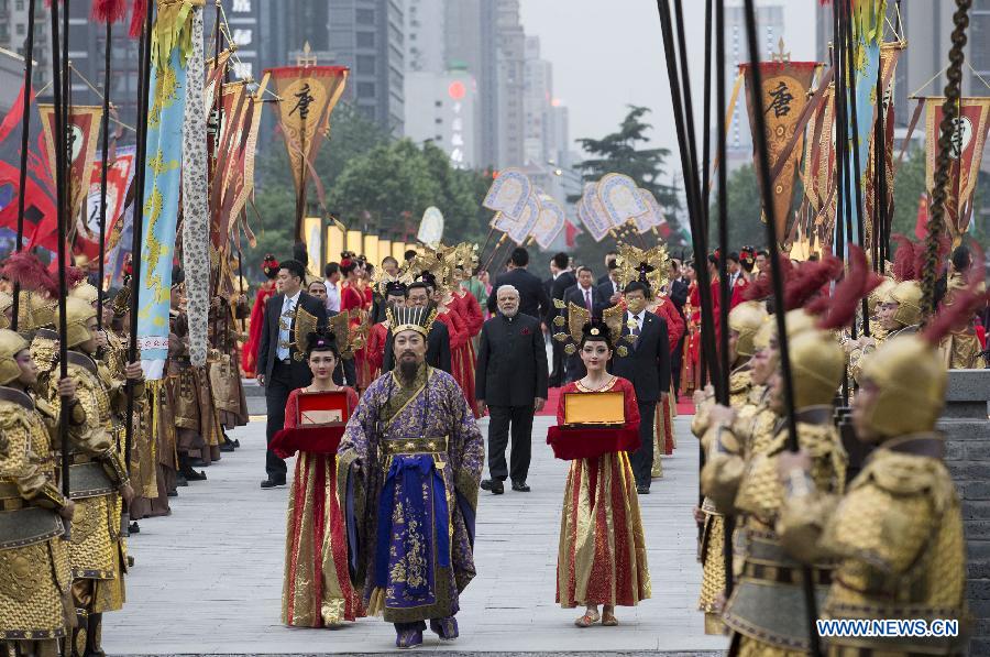 A welcoming ceremony is held for Indian Prime Minister Narendra Modi in Xi'an, capital city of northwest China's Shaanxi Province, May 14, 2015. (Xinhua/Huang Jingwen)