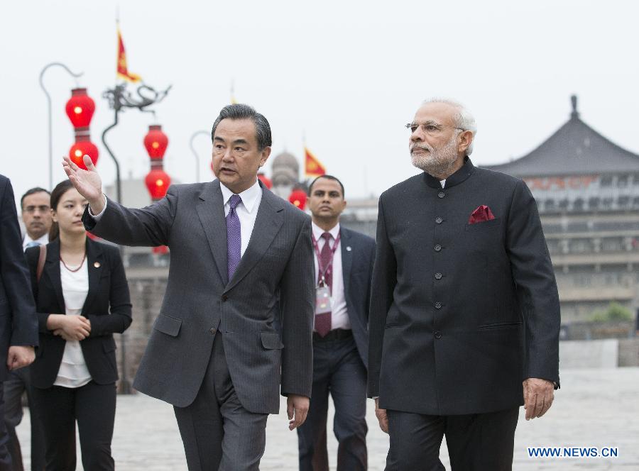 Chinese Foreign Minister Wang Yi (L front) accompanies Indian Prime Minister Narendra Modi(1st R) visiting the Xi'an city wall after a traditional Tang Dynasty (618-907) welcoming ceremony in Xi'an, capital of northwest China's Shaanxi Province, May 14, 2015. (Xinhua/Huang Jingwen)