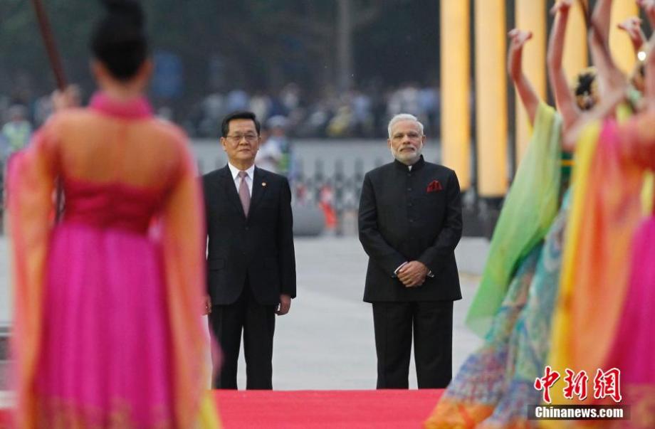 A welcoming ceremony is held for Indian Prime Minister Narendra Modi in Xi'an, capital city of northwest China's Shaanxi Province, May 14, 2015. (Photo/Chinanews.com)