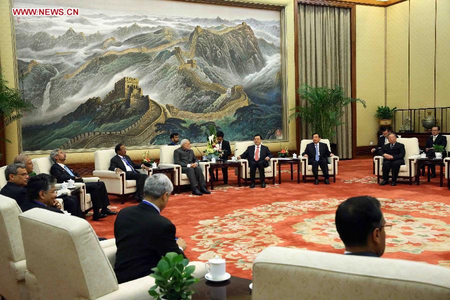 Zhang Dejiang, chairman of the Standing Committee of China's National People's Congress (NPC), meets with Indian Prime Minister Narendra Modi in Beijing, capital of China, May 15, 2015. (Xinhua/Liu Weibing)