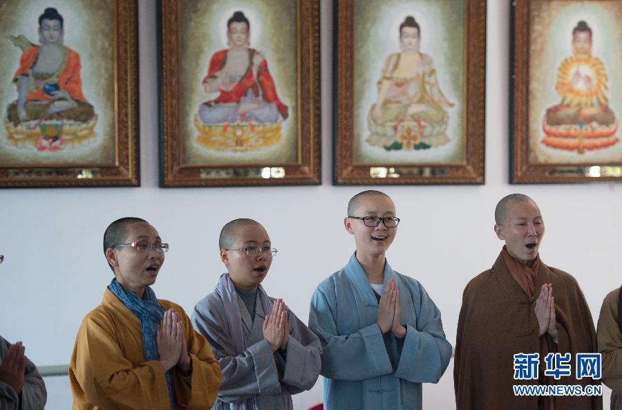 | Located in central China’s Hubei province, Tiantai Temple is famous for its Buddhist music. Young Buddhist monks and nuns play beautiful music with violins, cellos, pianos and other instruments. Playing Buddhist music is their way of self-cultivation. In 2008, Tiantai Temple formed its own band – Guangxuan Art Troupe, which now has over 40 members. The band is often invited to perform music and spread Buddhism outside the temple. (Xinhua/Cheng Min) |