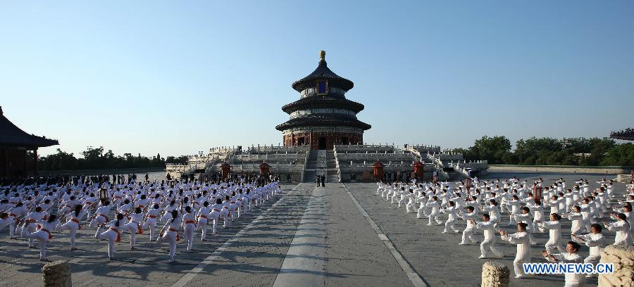Chinese Premier Li Keqiang and Indian Prime Minister Narendra Modi attend a Taichi and Yoga show at the Temple of Heaven in Beijing, capital of China, May 15, 2015. (Xinhua/Pang Xinglei)
