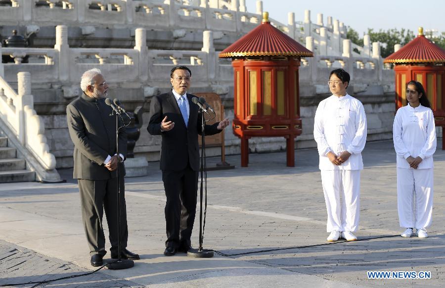 Chinese Premier Li Keqiang (2nd L) and Indian Prime Minister Narendra Modi (1st L) attend a Taichi and Yoga show at the Temple of Heaven in Beijing, capital of China, May 15, 2015. (Xinhua/Ma Zhancheng)
