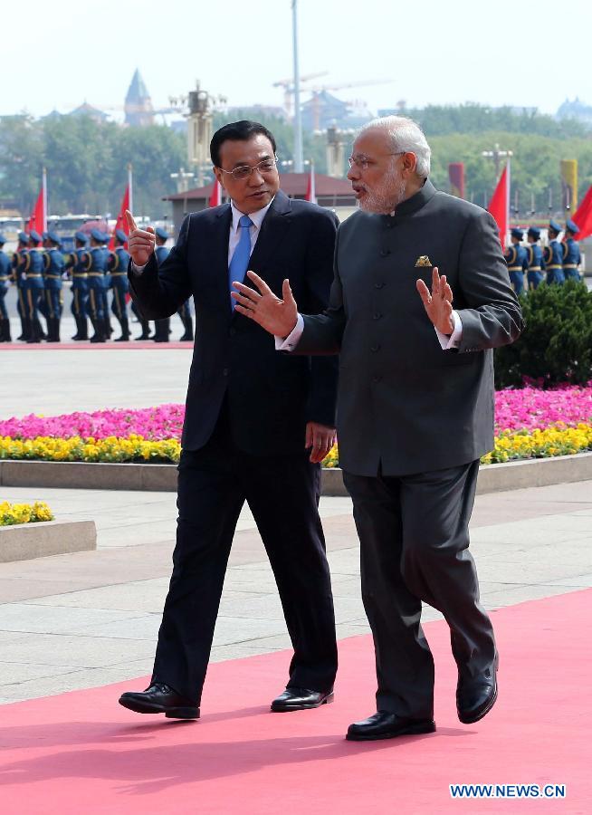Chinese Premier Li Keqiang (L) holds a welcoming ceremony for Indian Prime Minister Narendra Modi before their talks in Beijing, capital of China, May 15, 2015. (Xinhua/Liu Weibing)