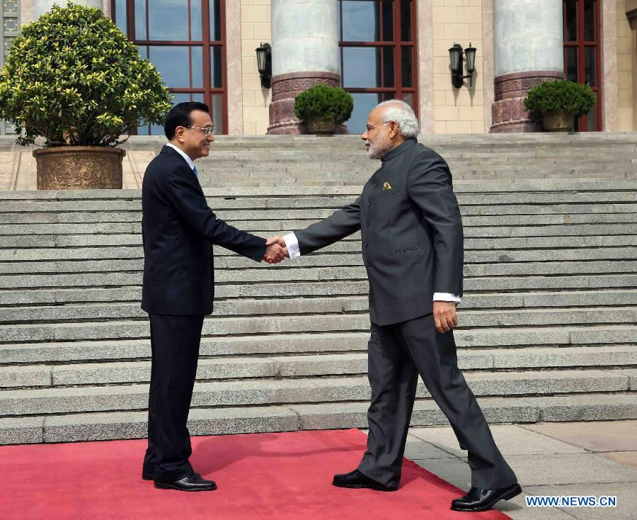 Chinese Premier Li Keqiang (L) holds a welcoming ceremony for Indian Prime Minister Narendra Modi before their talks in Beijing, capital of China, May 15, 2015. (Xinhua/Liu Weibing)