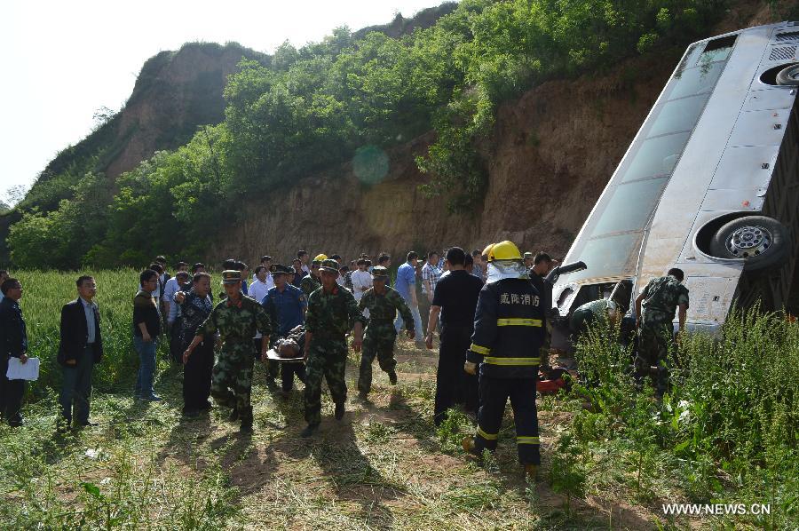 Rescuers work at the accident site after a bus overturned and fell into a valley in Chunhua county of Xianyang City, northwest China's Shaanxi Province, May 15, 2015. At least 33 people were killed and 6 others injured in the accident which happened at about 3:27 p.m. on Friday when a bus carrying 44 passengers and two drivers plunged 30 meters into a ravine. (Xinhua/Kong Weizhe)