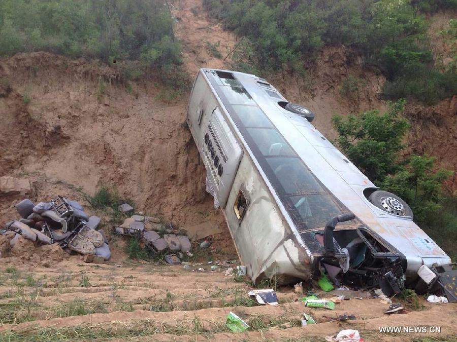 Photo taken on May 15, 2015 shows the accident site after a bus overturned and fell into a valley in Chunhua county of Xianyang City, northwest China's Shaanxi Province. At least thirty people were killed in the accident which happened at about 3:27 p.m. on Friday when a bus carrying 44 plunged 30 meters into a ravine. (Xinhua)