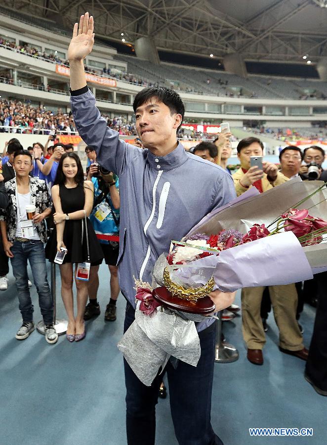 Former Chinese hurdler Liu Xiang, who retired last month, makes a emotional speech with tears in his eyes during his farewell ceremony after the Diamond League meeting in Shanghai, east China, on May 17, 2015. (Xinhua/Fan Jun)