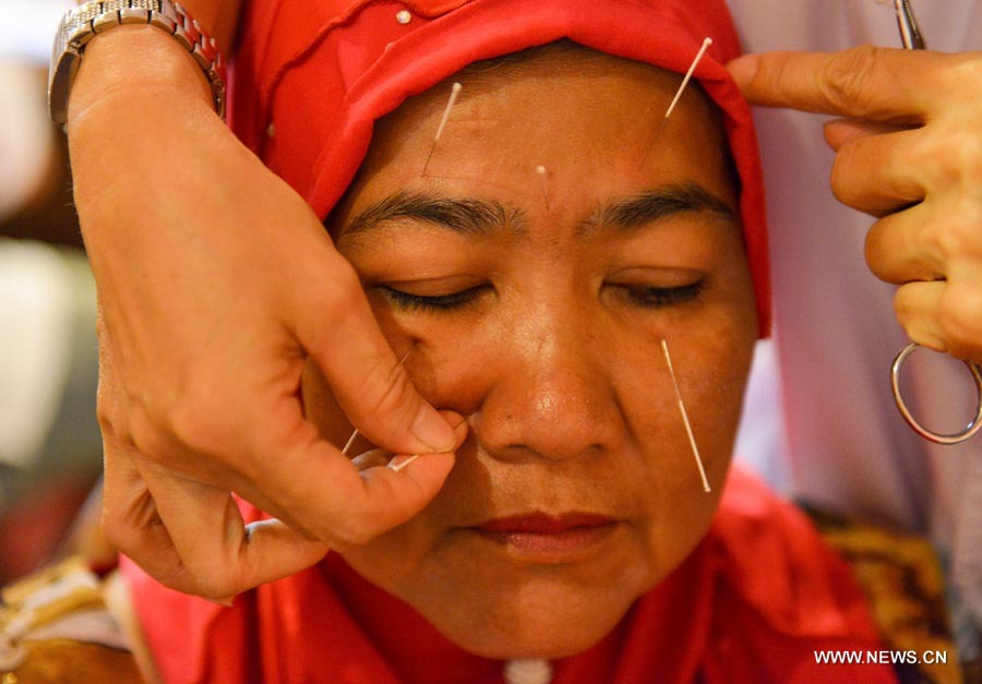 File Photo taken on Nov. 30, 2012 shows an UMNO (United Malays National Organization) member receiving acupuncture treatment in Kuala Lumpur, capital of Malaysia. Acupuncture and moxibustion are forms of traditional Chinese medicine widely practised in China and also found in regions of south-east Asia, Europe and the Americas. They are among the most widely practiced Chinese therapies in the country and is gaining increasing popularity in the West. The theories of acupuncture and moxibustion hold that the human body acts as a small universe connected by channels, and that by physically stimulating these channels the practitioner can promote the human body's self-regulating functions and bring health to the patient. This stimulation involves the burning of moxa (mugwort) or the insertion of needles into points on these channels, with the aim to restore the body's balance and prevent and treat disease. In acupuncture, needles are selected according to the individual condition and used to puncture and stimulate the chosen points. Currently, acupuncture sections were set up in all Chinese Medicine hospitals, which now number 2,000 all over China. It now can be applied to different systems inside the human body. In addition,much valuable information have been obtained in the study of acupuncture, in its regulative function, in easing pain, in developing the immunity system, and in the study of human channels, acupuncture points, and internal organs. It was listed as an intangible cultural heritage of humanity by the UNESCO in 2010. Moxibustion is usually divided into direct and indirect moxibustion, in which either moxa cones are placed directly on points or moxa sticks are held and kept at some distance from the body surface to warm the chosen area. Moxa cones and sticks are made of dried mugwort leaves. Acupuncture and moxibustion are taught through verbal instruction and demonstration, transmitted through master-disciple relations or through members of a clan. Currently, acupuncture and moxibustion are also transmitted through formal academic education. (Xinhua/Chong Yoon Chung)