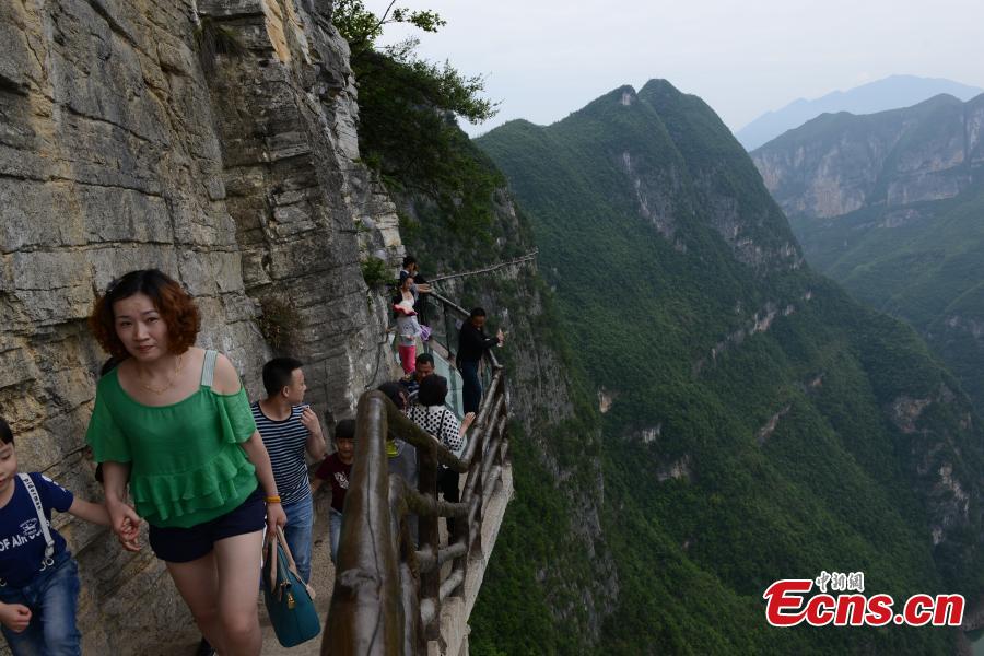 Tourists challenge themselves by following a walkway built on the edge of a cliff, about 1,000 meters above the ground, at a scenic spot in Yunyang county, Southwest China’s Chongqing municipality, May 16, 2015. The path, which is 3,200 meters long and one meter wide, includes a section made of glass that allows visitors to look straight down into the deep valley. (Photo: China News Service/Liu Xiaoyang)