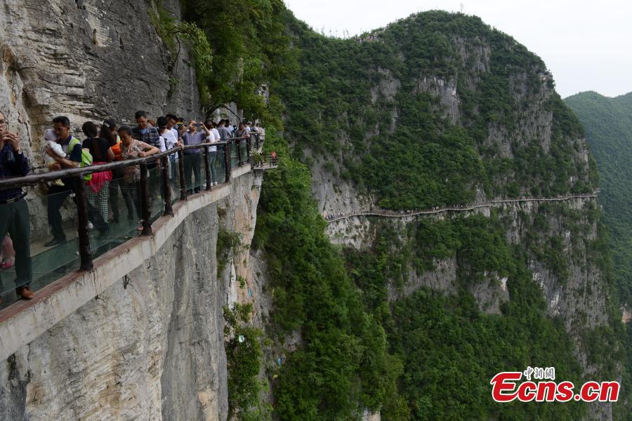 Tourists challenge themselves by following a walkway built on the edge of a cliff, about 1,000 meters above the ground, at a scenic spot in Yunyang county, Southwest China’s Chongqing municipality, May 16, 2015. The path, which is 3,200 meters long and one meter wide, includes a section made of glass that allows visitors to look straight down into the deep valley. (Photo: China News Service/Liu Xiaoyang)