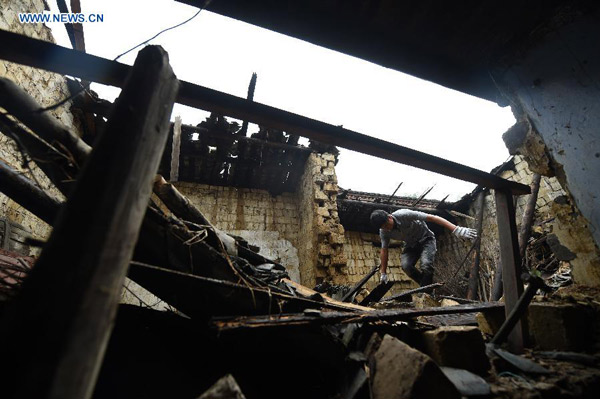 A villager clears the rubble of a house that is destroyed by heavy rain at Luojin Township of Yongfu County, south China's Guangxi Zhuang Autonomous Region, May 17, 2015. Downpours battered Guangxi on Saturday, damaging houses, disrupting traffic and killing at least four people. About 170,000 people in 20 counties were severely affected by the downpours and rain-triggered floods. Local governments have evacuated more than 5,700 people. The rain also toppled 155 houses, led to surging waters in 12 main rivers of Guangxi and blocked traffic in remote regions. (Xinhua/Lu Boan)