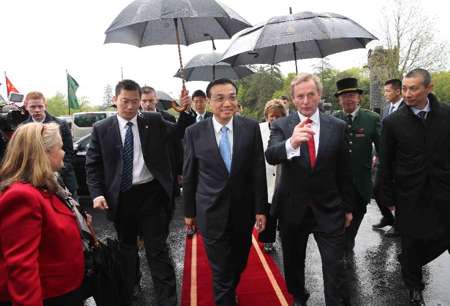 Chinese Premier Li Keqiang (C) is welcomed by his Irish counterpart Enda Kenny (2nd R front) before their talks in Shannon, Ireland, May 17, 2015. (Xinhua/Liu Weibing)
