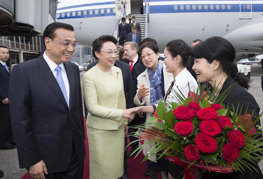 Chinese Premier Li Keqiang (1st L) and his wife, Prof. Cheng Hong (2nd L front) are greeted by working staff of Chinese Embassy in Ireland when arriving at the airport of Shannon, Ireland, May 17, 2015. Irish Finance Minister Michael Noonan, Chinese Ambassador Xu Jianguo and others also came to welcome Li and his wife at the airport. Li arrived here Sunday for a transit visit to Ireland before heading to Latin America for an official visit to Brazil. (Xinhua/Huang Jingwen)
