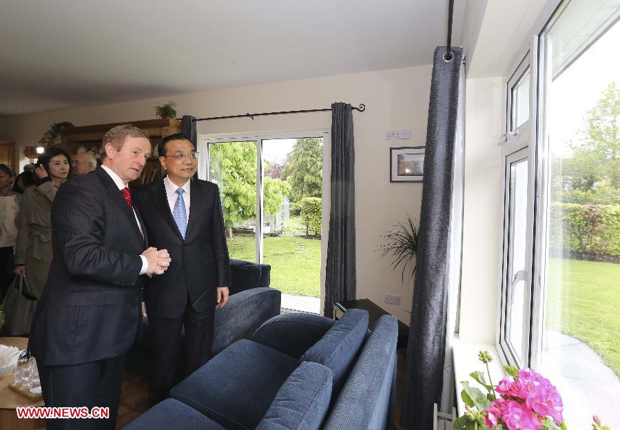Chinese Premier Li Keqiang (1st R) and his wife, Prof. Cheng Hong, in the company of Irish Prime Minister Enda Kenny (2nd R) and his wife Fionnuala O'Kelly, visit Garvey's Farmhouse, a typical Irish family-run cow farm in Shannon, Ireland, May 17, 2015.(Xinhua/Ding Lin)