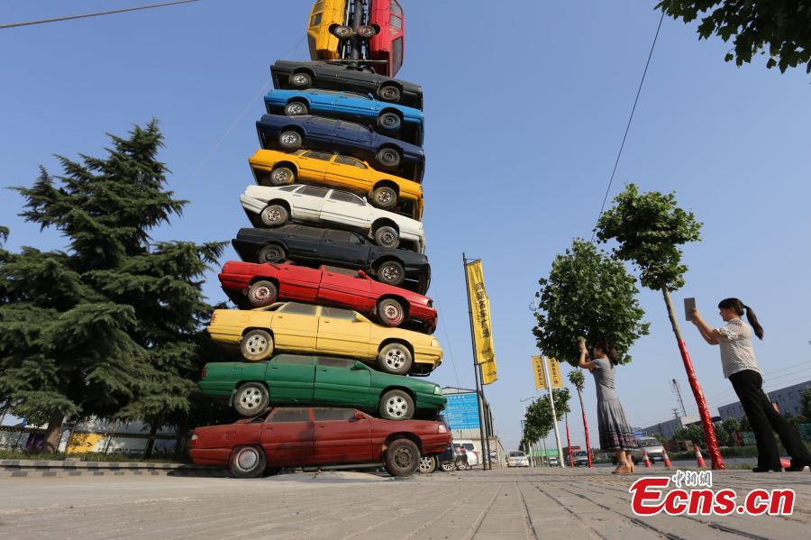 Twelve cars are stacked to form a tower in Zhengzhou city, capital of Central China's Henan province, May 18, 2015. A car dealer sponsored the 15-meter-high project at an auto industrial park. The marketing manager said the 12 cars were painted in different colors and firmly fixed to the ground to survive strong winds. (Photo: China News Service/Yang Zhenghua)
