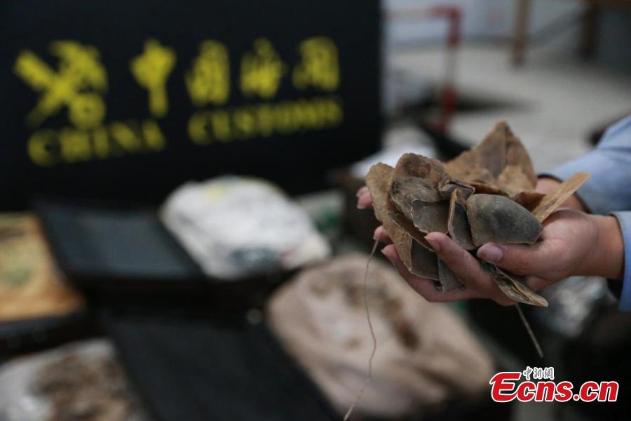 | An officer with China Customs shows off pangolin scales smuggled from Africa in Shanghai municipality, May 18, 2015. China Customs seized 249 kg of pangolin scales stored in nine separate pieces of luggage, the largest smuggling case of animal and plant products in Shanghai. A suspect worked with a colleague in Africa to smuggle the items and then sell in China. According to traditional Chinese medicine beliefs, the scales of a pangolin may help reduce swelling and boost lactation. (Photo: China News Service/Huang Shangshang) |