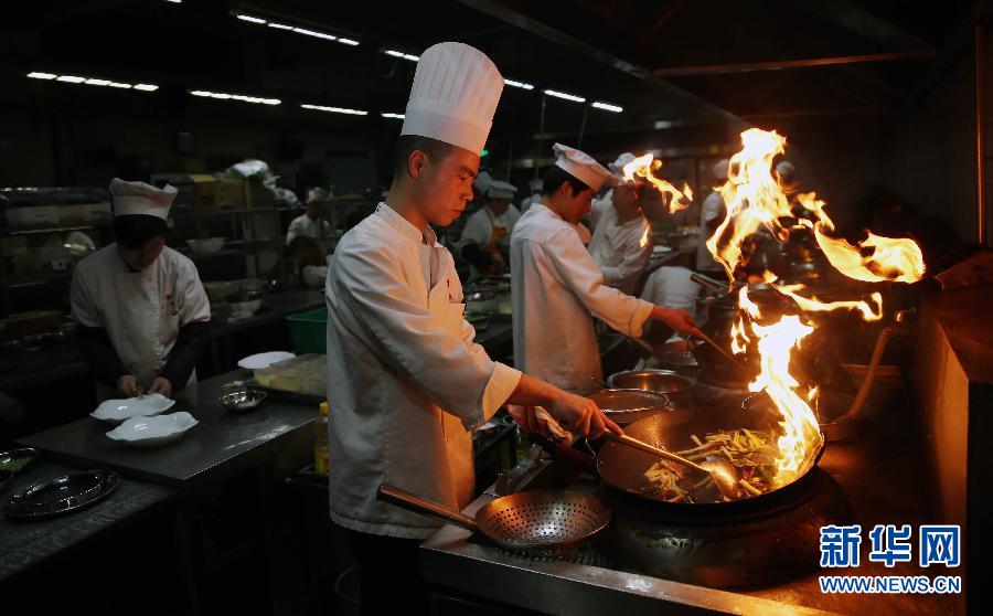 Wen Mao cooks Spring Festival meal at the restaurant, Feb. 18, 2015. (Xinhuanet/Li Ga)