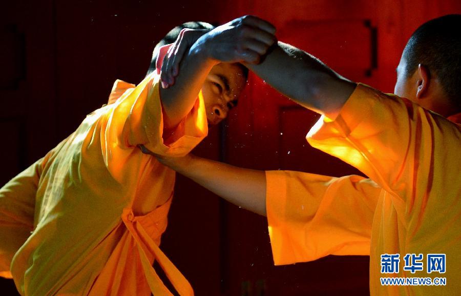 A monk practices martial art, May 13, 2015. (Xinhua/Wei Peiquan)