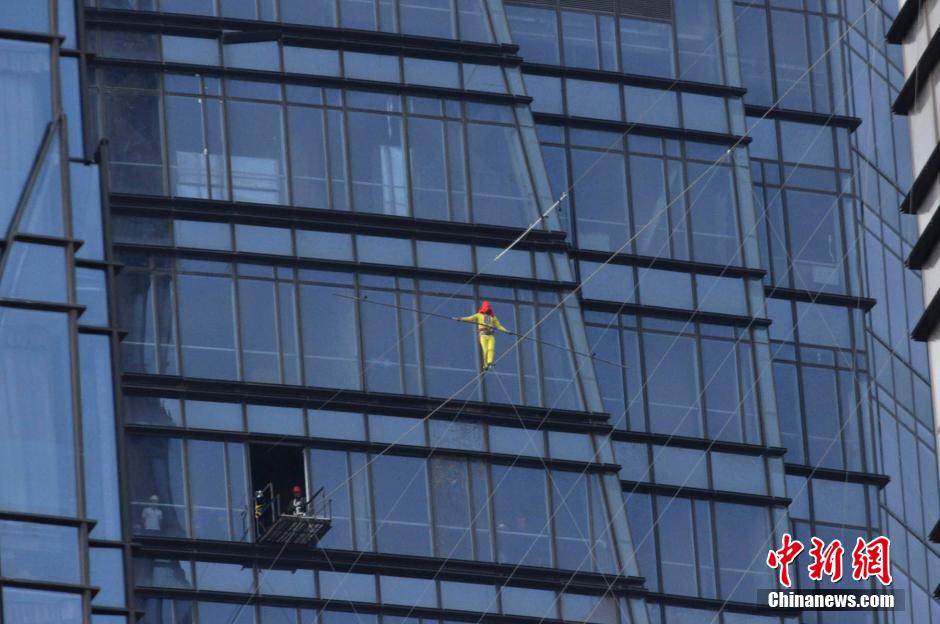 Chinese tightrope walker Aisikaier successfully sets a new world record for tightrope walking in Kunming, southwest China’s Yunnan province on May 16, 2015. With eyes covered, Aisikaier walked backwards on a tightrope 150 meters above the ground between the twin towers of Kunming Wanda Plaza. It took him 6 minutes and 40 seconds to finish the journey and then he walked back and forth several times and performed some stunts on the tightrope. (Chinanews/Li Weihua)
