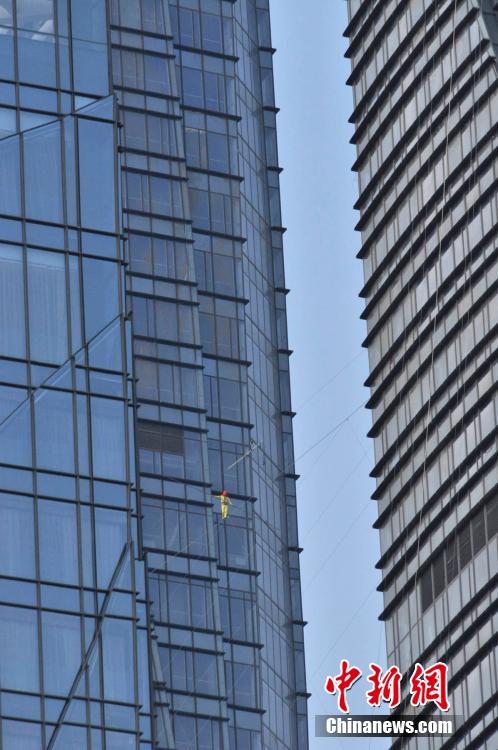 Chinese tightrope walker Aisikaier successfully sets a new world record for tightrope walking in Kunming, southwest China’s Yunnan province on May 16, 2015. With eyes covered, Aisikaier walked backwards on a tightrope 150 meters above the ground between the twin towers of Kunming Wanda Plaza. It took him 6 minutes and 40 seconds to finish the journey and then he walked back and forth several times and performed some stunts on the tightrope. (Chinanews/Li Weihua)