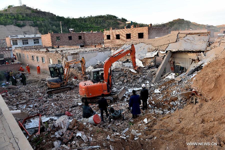 Rescuers search for the missing in the rubble at Yimin New Village of Tuban Town in Linxian County, north China's Shanxi Province, May 20, 2015. Four people were dead and four others missing in a landslide of a loess hill burst burying four farmers' houses Tuesday evening. (Xinhua/Zhan Yan)