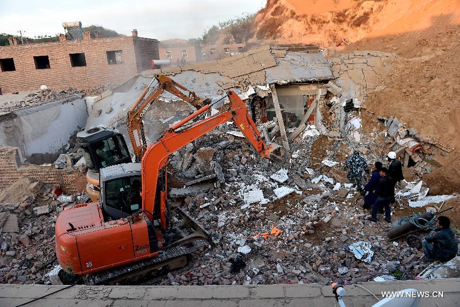 Rescuers search for the missing in the rubble at Yimin New Village of Tuban Town in Linxian County, north China's Shanxi Province, May 20, 2015. Four people were dead and four others missing in a landslide of a loess hill burst burying four farmers' houses Tuesday evening. (Xinhua/Zhan Yan)