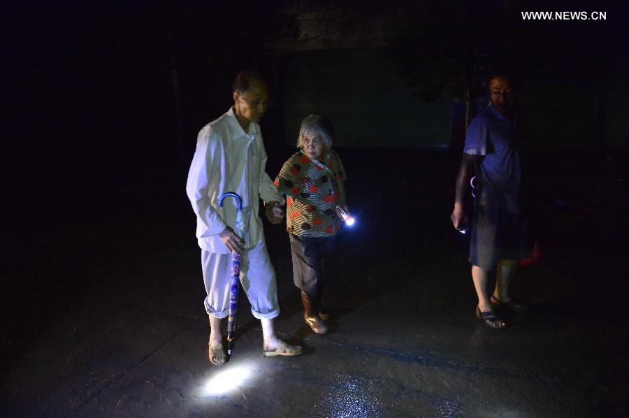 Elderly residents walk on a flooded street in Hengjiang Town of Shicheng County, east China's Jiangxi Province, May 19, 2015. Seven people have been killed in landslides and house collapses caused by torrential rain in Jiangxi since Monday. The downpour has flooded 13,810 hectares of farmland, and destroyed hundreds of homes, forcing almost 10,000 to leave their homes. (Xinhua/Zhou Mi)