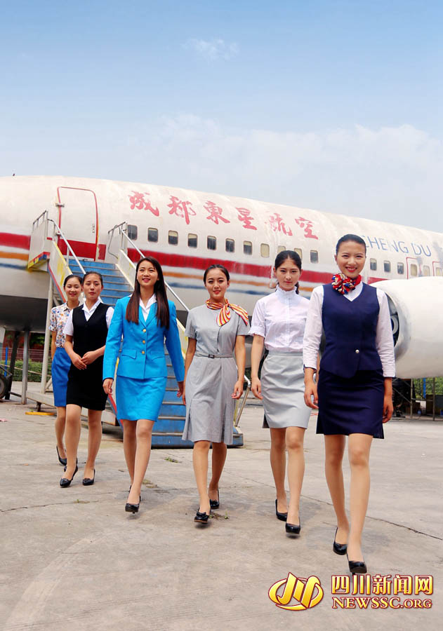 Students present the air stewardess uniforms of the past in Chengdu East Star Airlines Travel College, southwest China's Sichuan province, May 12, 2015. You can see the fashion changes through the years when you look at these uniforms. (Photo/newssc.org)